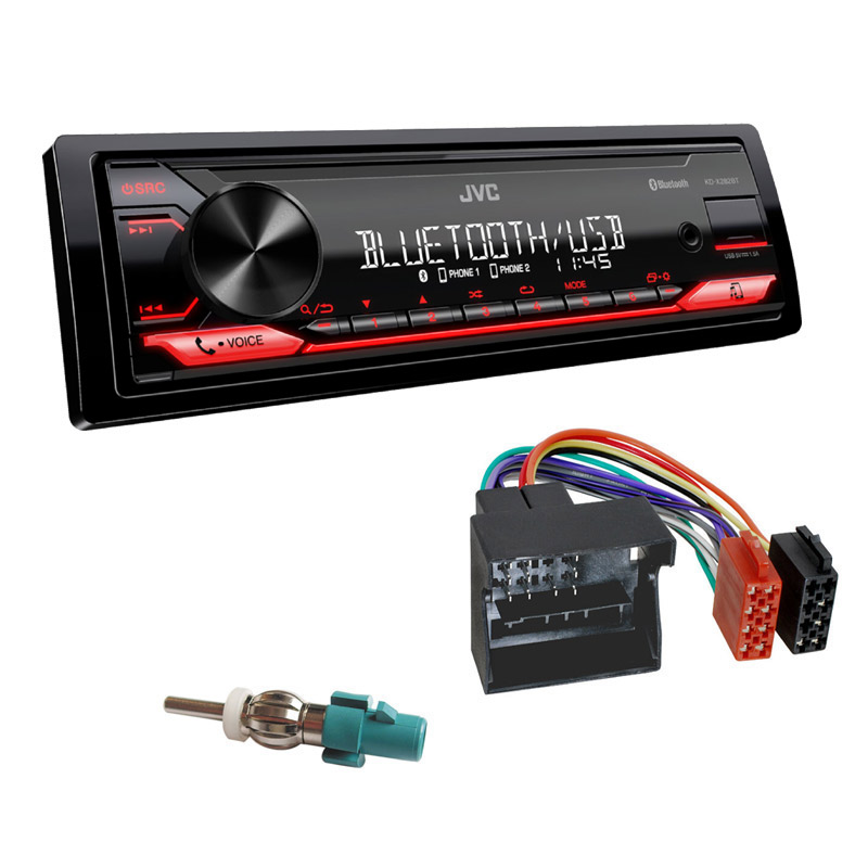 Instalační sada s autorádiem bez CD mechaniky JVC KD-X282BT, které má červeně podsvětlené ovládací tlačítka. Autorádio disponuje USB vstupem a přímým připojením telefonů s OS Android (přes USB) a také iPod/iPhone. Hlavní devízou tohoto autorádia je vestavěné Bluetooth rozhraní pro Handsfree a Audiostreaming. Díky absenci mechaniky má autorádio zmenšenou montážní hloubku (cca 1/2 oproti autorádiu s mechanikou).