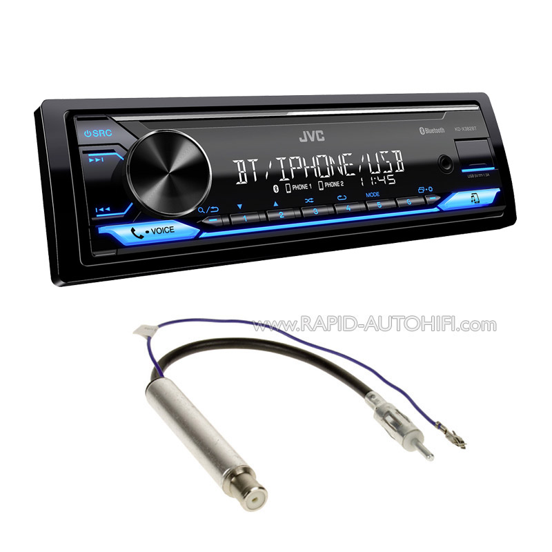 Instalační sada s autorádiem bez CD mechaniky JVC KD-X382BT, které má modře podsvětlené ovládací tlačítka. Autorádio disponuje USB vstupem a přímým připojením telefonů s OS Android (přes USB) a také iPod/iPhone. Hlavní devízou tohoto autorádia je vestavěné Bluetooth rozhraní pro Handsfree a Audiostreaming. Autorádio podporuje funkcni JVC Smart Music (interpretace hudebních souborů z mobilního telefonu s Android OS přes USB nebo Bluetooth). Díky absenci mechaniky má autorádio zmenšenou montážní hloubku (cca 1/2 oproti autorádiu s mechanikou).