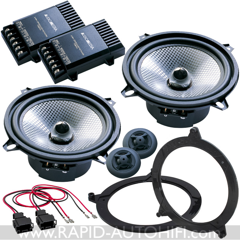 Obsahuje 13 cm 2-pásmové komponentní reproduktory EX52K řady Excellence Line italského výrobce AUDIOMEDIA, dále plastové redukce pro montáž do původního prostoru originálních reproduktorů a kabelové adaptéry pro zapojení reproduktorů do originálního reproduktorového svazku BMW.