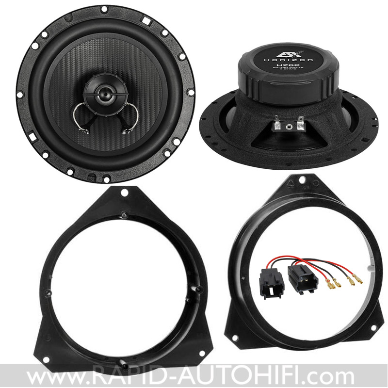 Obsahuje výkonné koaxiální 2-pásmové reproduktory řady Horizon německého výrobce ESX HZ62 a vše potřebné pro korektní výměnu. Tedy redukční plastové kroužky a kabelovou přechodku (adaptér) z originálního kabelového svazku Citroen na klasické reproduktorové konektory.