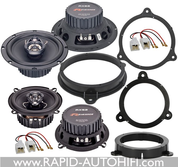 Obsahuje kvalitní 2-pásmové koaxiální reproduktory německého výrobce RENEGADE RX62 (přední dveře), 13 cm 2-pásmové koaxiální reproduktory RENEGADE RX52 (zadní dveře) a montážní redukce a kabelové redukce pro zapojení reproduktorů do originálního reproduktorového svazku.