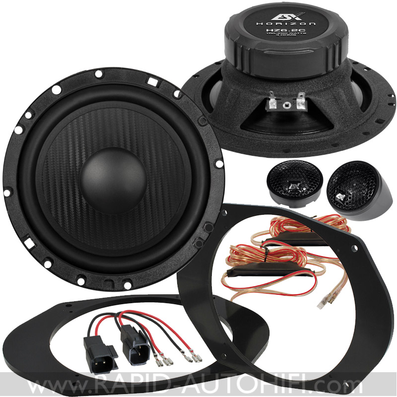 Obsahuje kvalitní 2-pásmové komponentní reproduktory HZ6.2CV2 řady Horizon německého výrobce ESX a vše ostatní, co je zapotřebí pro montáž reproduktorů do tohoto typu vozu. Tedy montážní redukce z 6x8" rozměru na 16.5 cm a kabelové redukce z originálního kabelového svazku na klasické reproduktorové konektory.