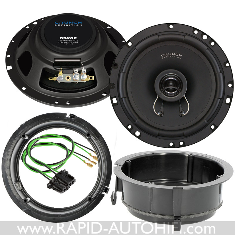 Obsahuje kvalitní 16.5 cm koaxiální 2-pásmové reproduktory DSX62 amerického výrobce CRUNCH a vše potřebné pro korektní výměnu. Tzn. plastové redukce pro montáž do původního prostoru originálních reproduktorů a kabelové adaptéry pro zapojení reproduktorů do originálního reproduktorového svazku.