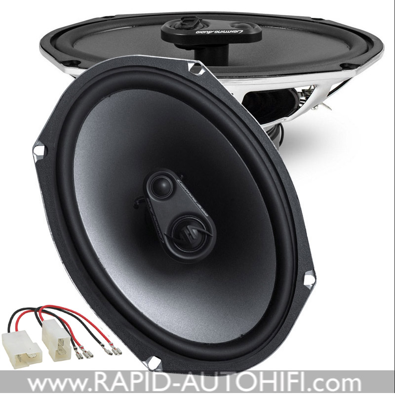Obsahuje výkonné 15 x 23 cm oválné 3-pásmové triaxiální reproduktory S4.69.3 vyšší řady Strike amerického výrobce Lightning Audio a kabelové redukce pro připojení reproduktorů do originálního svazku Mini Cooper.