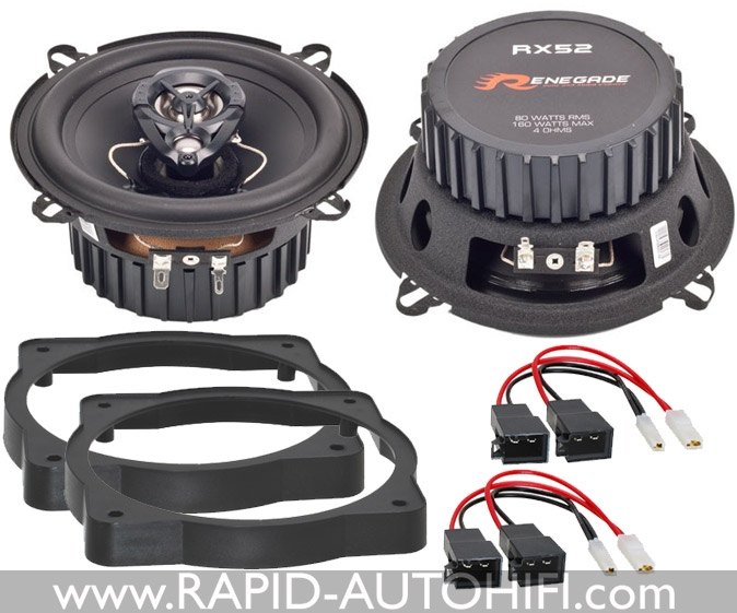 Obsahuje kvalitní 2-pásmové 13 cm reproduktory RX52 německého výrobce RENEGADE, kabelové redukce pro zapojení reproduktorů do originálního reproduktorového svazku a montážní plastové redukce.