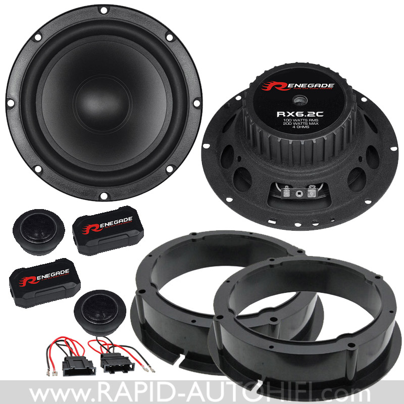 Obsahuje kvalitní 2-pásmové komponentní reproduktory RX6.2C MK2 německého výrobce RENEGADE, dále plastové redukce pro montáž do původního prostoru originálních reproduktorů a kabelové adaptéry pro zapojení reproduktorů do originálního reproduktorového svazku.