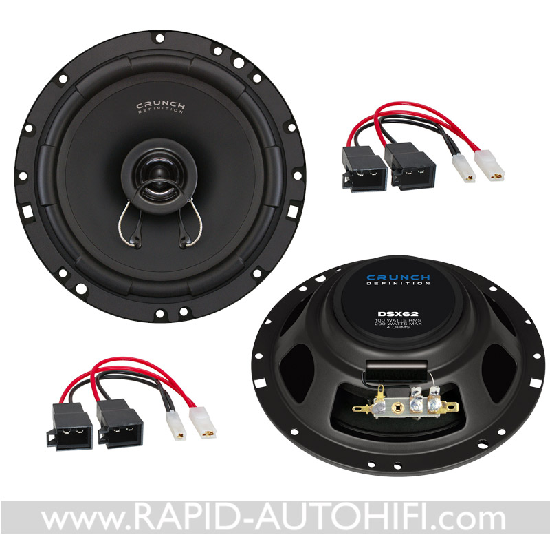 Obsahuje kvalitní 16.5 cm koaxiální 2-pásmové reproduktory DSX62 amerického výrobce CRUNCH a vše potřebné pro korektní výměnu. Tedy kabelové redukce z originálního kabelového svazku VW na klasické reproduktorové konektory..
