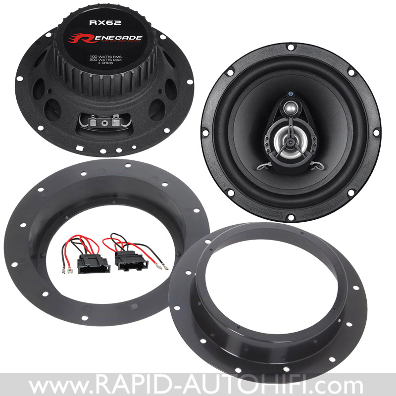 Obsahuje kvalitní triaxiální třípásmové reproduktory německého výrobce RENEGADE RX62 německého výrobce RENEGADE a vše potřebné pro korektní výměnu. Tedy montážní redukce a kabelové redukce z originálního kabelového svazku VW na klasické reproduktorové konektory